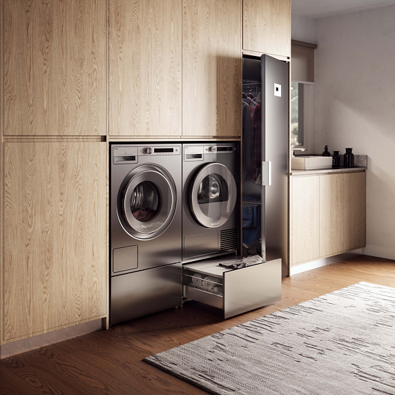 Высота установки ящика регулируется — его можно поднять до 30 см от пола, адаптируя под конкретные условия помещения. Это особенно удобно, если необходимо выровнять технику по высоте или облегчить доступ к загрузке белья. При этом стоит учитывать, что размещение устройства в вертикальной колонне не предусмотрено производителем — оптимальное использование подразумевает отдельную установку под оборудование.