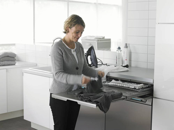 Выдвижная полка для стиральных и сушильных машин. Съемная проволочная корзина для облегчения загрузки, выгрузки и сортировки белья.