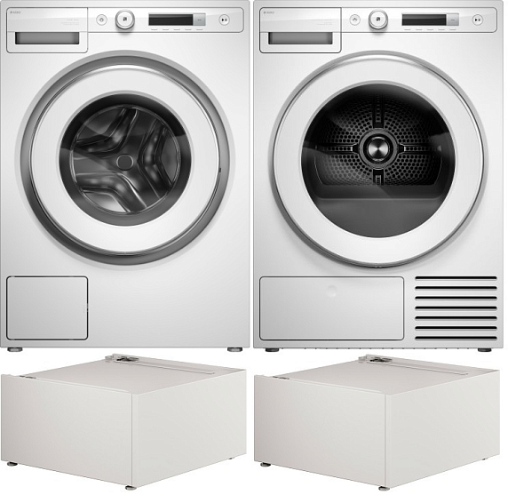 Здравствуйте, в базовый комплект входит стиральная машина Asko W2084.W/3 и сушильная машина Asko T208C.W. Обе с загрузкой 8 кг, дисплеем, отложенным стартом и базовым набором программ для стирки и сушки. У стиральной машины есть программы: «Автоматическая», «Шерсть» и защита от сминания. У сушильной машины — автопрограмма, а также возможность настройки сушки по времени.