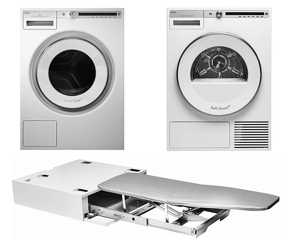 Комплект Asko Logic 6 (W4096P.W/3, T409HS.W, HI1153W) вышел в линейке Logic. Она отличается функциональностью и расширенным пакетом программ. Позаботиться о чистоте белья стало гораздо проще. Инверторный мотор, встроенный в оба прибора, повышает эффективность результата и снижает уровень шума, износ деталей и потребление электричества. Вместительность здесь достигает 9 кг за одну загрузку. Кроме того, в набор входит складная гладильная доска. Механизм находится за декоративной панелью, а, когда он нужен, он выдвигается вперёд.