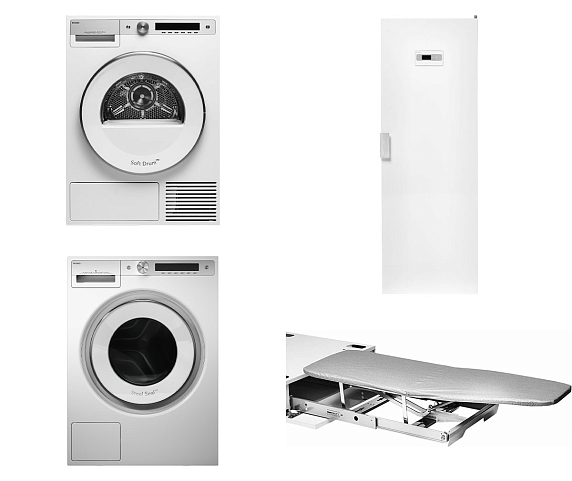 В комплект Asko Style 11 входит 3 прибора и аксессуар: стиральная машина W6098X.W/3, сушильная машина T608HX.W, сушильный шкаф DC7784V.W и гладильная доска HI1153W. Вся техника выполнена в классическом белом цвете.