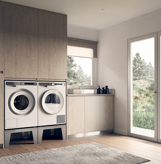 В комплект Asko Style 9 входит 2 прибора и 2 аксессуара: стиральная машина W6098X.W/3, сушильная машина T608HX.W и 2 ящика с выдвижной полкой HPS5323W. Вся техника выполнена в классическом белом цвете.