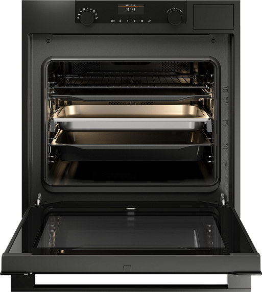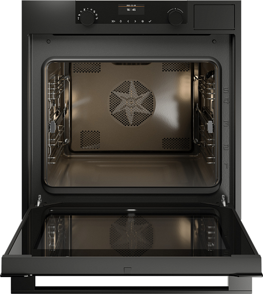 Модель выполнена в изысканном графитовом цвете, что делает её универсальным выбором для любого кухонного интерьера. Панель управления отличается эргономичностью и стильным минимализмом. Сенсорные элементы управления и поворотные регуляторы обеспечивают точную настройку параметров, а цветной TFT-дисплей с интуитивно понятным интерфейсом отображает всю необходимую информацию в реальном времени, делая процесс готовки максимально удобным.