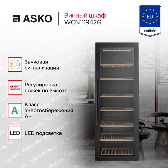 Охлаждение и поддержание нужной температуры в винном шкафу Аско WCN111942G производится с помощью компрессора и экологичного хладагента R600A. Сенсорная панель управления расположена над верхней полкой. Температура регулируется от 5 до 20 градусов. Специальная емкость для воды поддерживает необходимую влажность. Значения высвечиваются на дисплее. Можно заблокировать настройки. Холодильник сигнализирует, если по каким-то причинам изменяются основные показатели, при открытой дверце более 10 минут, а также если появилась вибрация.