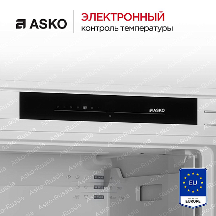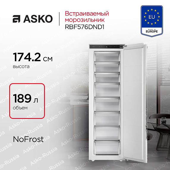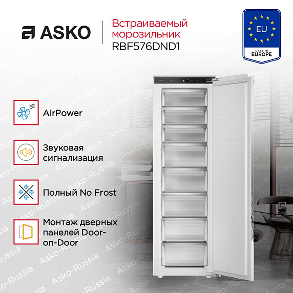 Встраиваемая морозилка ASKO RBF576DND1 выполнена в светлом, нейтральном оттенке, который идеально сочетается с любыми фасадами. Благодаря системе Door-on-Door вы можете установить родную дверцу кухонного шкафа прямо на корпус — результат: ровная поверхность без визуальных разрывов. Дверной упор расположен справа, что упрощает планировку открывания под вашу кухню. Габариты корпуса — 177 см в высоту и 54 см в глубину — рассчитаны на стандартную нишу размером 177,5-178 × 56-57 × 56 см, поэтому при монтаже важно соблюсти точные размеры проёма.