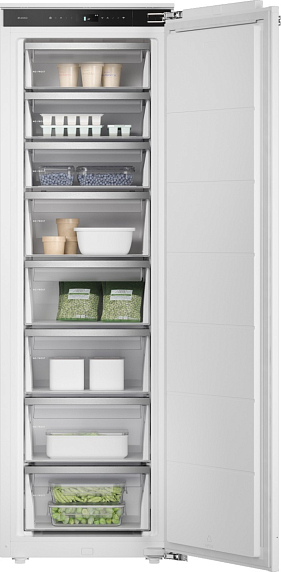 Внутри — 189 литров полезного объёма, разделённых на восемь отсеков с выдвижными ящиками на телескопических направляющих. Это не просто ящики: они плавно выкатываются до конца, позволяя легко доставать даже тяжёлые пакеты без перекладывания содержимого. Управление реализовано через сенсорную панель с дисплеем — настройка температуры происходит лёгкими касаниями, а адаптивная система автоматически поддерживает стабильный микроклимат, учитывая уровень загрузки. При необходимости быстро заморозить свежие продукты включается режим Fast Freeze — он фиксирует вкус и текстуру буквально за часы.