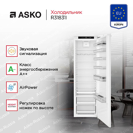 Встраиваемый холодильник Asko R31831I представляет собой однокамерную модель серии Premium. Такое устройство работает за счёт инверторного компрессора, который отличается длительным сроком службы, разумным потреблением электроэнергии, а также более низким уровнем шума. Жёсткое крепление типа door-on-door обеспечивает мягкое закрытие, а также возможность открыть дверцу на 115 градусов. Если угол менее 15 градусов, то дверцы закроется автоматически. Капельная система охлаждения подразумевает естественный микроклимат, а также периодическое подтапливание наледи на стенках, благодаря чему разморозка происходит автоматически.
