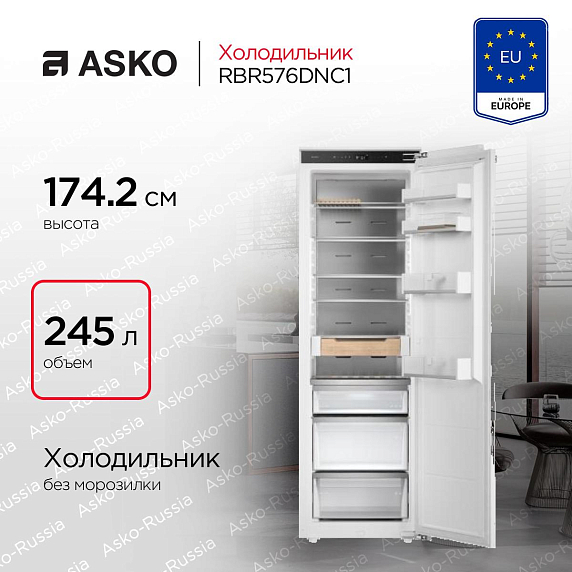 Встраиваемый холодильник ASKO RBR576DNC1 выполнена в светлой, нейтральной палитре — такой дизайн легко вписывается в любую кухню, не привлекая излишнего внимания. Её габариты — 174,2 см в высоту, 55,7 см в ширину и 54,6 см в глубину — идеально соответствуют стандартной нише размером 177,5-178 × 56-57 × 56 см, что обеспечивает плотную и аккуратную встройку. Благодаря системе Door-on-Door вы можете закрепить родную дверцу кухонного шкафа прямо на корпус, сохранив визуальное единство гарнитура. Дверной упор расположен справа, но при необходимости дверь легко перенавесить под вашу планировку.