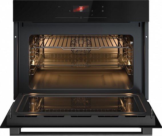 Электрический духовой шкаф из серии Essence объединяет микроволновую функцию и классические режимы нагрева в одном компактном корпусе. Произведённый в Словении, он поставляется с двухлетней гарантией, имеет объём 50 литров и энергоэффективность класса A++. Внешне модель выделяется строгой чёрной стеклянной панелью, цветным TFT-дисплеем и сенсорными поворотными регуляторами — решение, сочетающее эстетику минимализма с удобством управления.