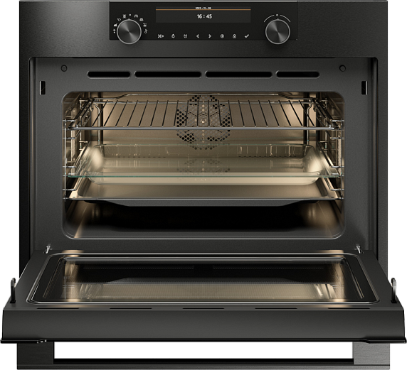 Духовка имеет технологию AquaClean. Она позволяет налить воду в выемку нижней часть камеры, включить нагрев. Вода испарится и загрязнения на внутренних стенках прибора размягчатся, что упростит их очистку. Помимо основных 11 режимов нагрева имеется ещё 3 специальных для работы с СВЧ. Особенная технология Stirrer помогает микроволнам отражаться от поверхности камеры так, что они равномерно воздействуют на помещённое блюдо. Благодаря этому конструкция не нуждается в поворотном столе, а в процессе приготовления задействуется вся поверхность.