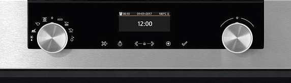 Управление ручкой JogDial представляет собой два утапливаемых поворотных регулятора. Они плавно переключают параметры, выводимые на чёткий текстовый дисплей. Как правило, такая система навигации состоит из двух ручек. С помощью левой можно настраивать необходимые режимы функционирования духового шкафа. Правая же отвечает за выбор настроек.