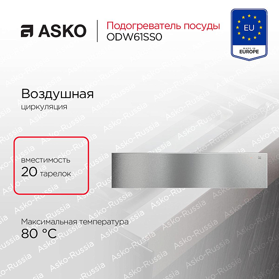 Подогреватель посуды ASKO ODW61SS0 — это высококачественное оборудование, созданное в Словении, которое предоставляет двухлетнюю гарантию на свою продукцию. Серия CRAFT, к которой принадлежит этот подогреватель, славится своим вниманием к деталям и стремлением к совершенству в каждой детали.