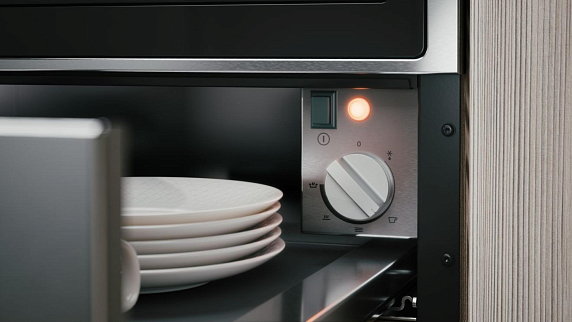 В подогревателе используются телескопические направляющие, что обеспечивает плавное и безопасное движение ящика. Механизм открывания является нажимным, что упрощает процесс использования. Вместимость подогревателя впечатляет: он может вместить до 20 тарелок, 40 чайных чашек или 80 кофейных чашек одновременно.