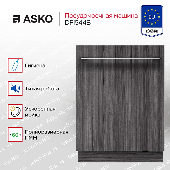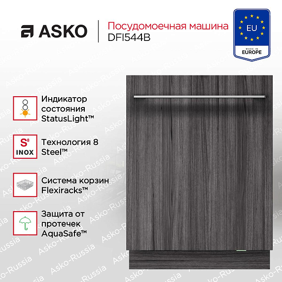 Встраиваемая посудомоечная машина ASKO DFI544B — это высококачественное бытовое оборудование, произведенное в Словении, которое сочетает в себе эстетику дизайн-линии Logic и функциональность современной технологии. Она полностью встраивается в кухонный гарнитур, обеспечивая гармоничное сочетание с общим интерьером. Стильный титановый цвет панели управления и цельнометаллическая дверь подчеркивают ее современный дизайн.
