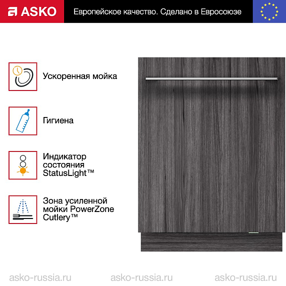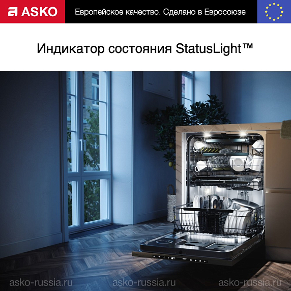 Индикатор состояния StatusLight™ расположен в нижней части посудомоечной машины Asko. Он имеет три цветовых режима. Синий — можно добавить посуду, несмотря на то, что программа запущена. Красный — загружать дополнительно ничего нельзя, иначе эффективность мойки снизится. Мигающий красный сигнал указывает на неисправность. Зелёный — программа завершена. Индикатор продолжает гореть в течение 60 минут.