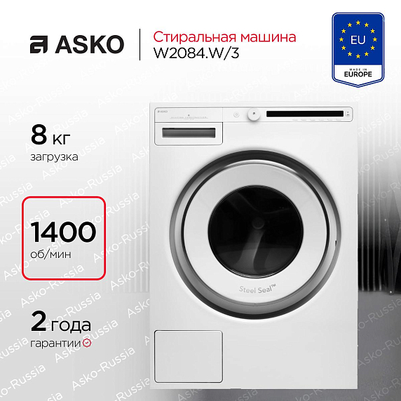 Стиральная машина Asko W2084.W/3 — одна из самых популярных моделей линейки Classic. Она сочетает в себе классический дизайн, привычный белый цвет, загрузку в 8 кг, а также достаточно высокую скорость отжима в 1400 об./мин.