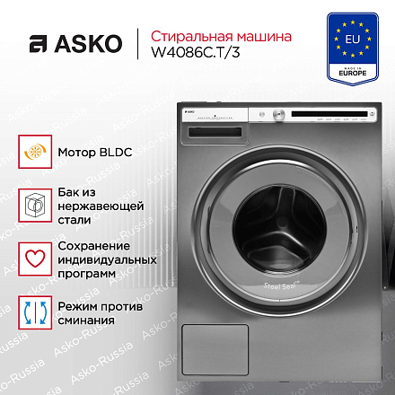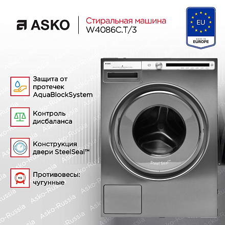 Модель имеет лёгкое электронное управление. Стиральная машина Аско W4086C. T/3 может выстирать бельё из различных материалов на 23 программах с дополнительными опциями, используя нагрев воды до 90 градусов. Большое количество программ включает такие популярные, как гигиена, антиаллергенная, экономичная, хлопок, ручная, быстрая и другие. Опции могут ускорять время стирки или замедлять, но экономить ресурсы. В данной модели есть функция освежения паром, которая может избавить от неприятных запахов чистые, но залежалые или незаношенные вещи. Можно отложить старт до 24 часов. Для безопасности внедрены функции защиты от протечек и переполнения, блокировки от случайного перепрограммирования детьми. Дверцу невозможно открыть во время работы. Возникший дисбаланс машина устраняет самостоятельно.