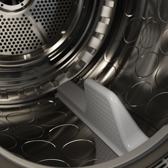 Конструкция лопастей специально разработана таким образом, чтобы они максимально бережно направляли движение находящихся внутри барабана вещей по траектории восьмерки. Благодаря этому не допускается сбивание белья в единый ком, его скручивание и интенсивное сминание, обеспечивается равномерность тепловой обработки и свободная циркуляция воздушных потоков.