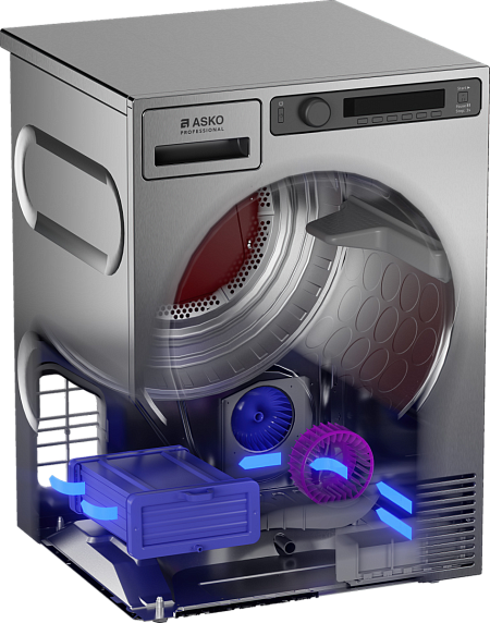 Профессиональная сушильная машина Asko TDC1772C.T представлена в цвете «Титан». Особая траектория вращения барабана и лопасти Butterfly™ предотвращают скручивание белья.