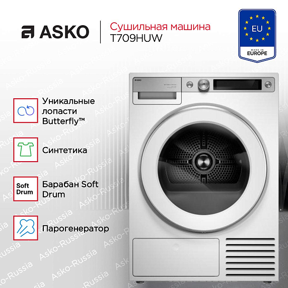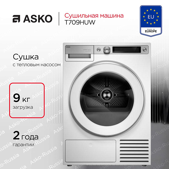 • Энергосбережение: ASKO T709HUW относится к классу энергоэффективности, что позволяет сократить расходы на электроэнергию без ущерба для производительности.