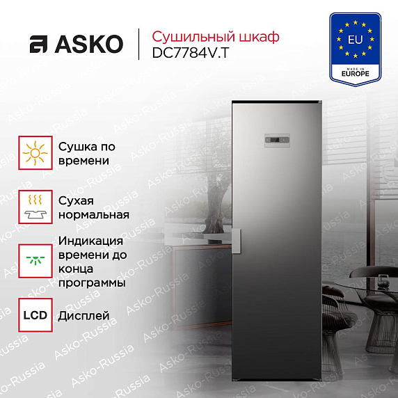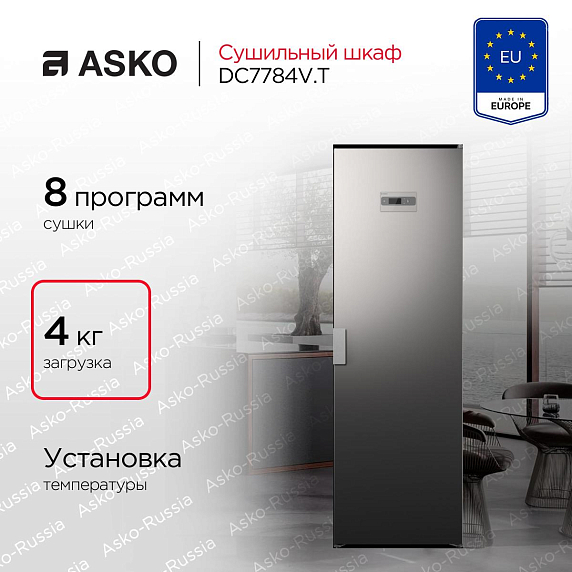 Сушильный шкаф ASKO DC7784V.T — элегантное и функциональное решение для щадящей обработки деликатных изделий в домашних условиях. Внешняя отделка цвета титан и панель управления из нержавеющей стали подчёркивают премиальную эстетику, при этом корпус выполнен из прочной нержавейки, обеспечивающей простоту ухода и устойчивость к коррозии. Высота 184 см при ширине 59,5 см и глубине 60,8 см делает прибор компактным, хотя вместимость рассчитана на 4 кг тканей; общая длина вешалок достигает 16 метров, что позволяет аккуратно развесить блузы, рубашки, пальто и аксессуары. Возможность установки в нише либо закрепления к стене добавляет свободы при планировке интерьера. Дверной упор расположен справа по умолчанию, но дверцу можно перенавесить под нужное расположение, а встроенный дверной выключатель обеспечивает безопасность при работе.