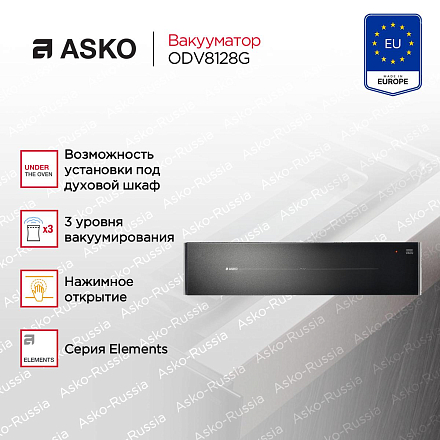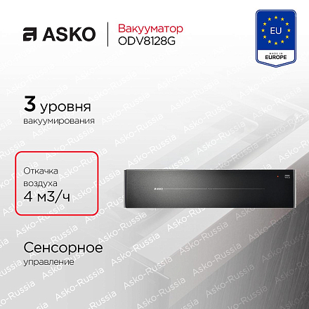 Вакууматор Asko ODV8128G — это функциональный прибор для современной кухни. Модель позволит упаковать продукты для длительного хранения, подготовить ингредиенты для приготовления Су-вид и даже повторно запаковать уже открытые пакеты. Устройство не займет много пространства, поскольку имеет небольшие габариты: высота — 14,1 см, ширина — 59,7 см, глубина — 55 см. У данного устройства фасад выполнен из чёрного закалённого стекла, а не окрашенной нержавеющей стали. А индикатор, расположенный на фронтальной части, помогает отслеживать работу техники. Нажимной механизм push2Open позволил избавиться от ручки и тем самым сделал эксплуатацию безопаснее. Открыть прибор можно и локтем, просто нажав на фасад.