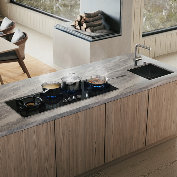 Внутреннее устройство предусматривает четыре конфорки с общей отдачей 14 кВт, включая две мощные боковые зоны по 6 кВт каждая и две центральные по 2 кВт, что делает панель универсальной для всего спектра кулинарных задач — от медленного томления до интенсивного обжаривания. Особое внимание уделено специализированной конфорке Fusion Volcano Wok, которая обеспечивает концентрированный подогрев под низом большой вок-сковороды, способствует быстрому запечатыванию вкуса и бережёт время при приготовлении азиатских блюд. Механическое управление реализовано через поворотные переключатели, удобные на ощупь и надёжные в эксплуатации; имеется встроенный электроподжиг для мгновенного розжига пламени и газ-контроль, автоматически перекрывающий подачу топлива при случайном гашении фитиля, что повышает уровень безопасности.