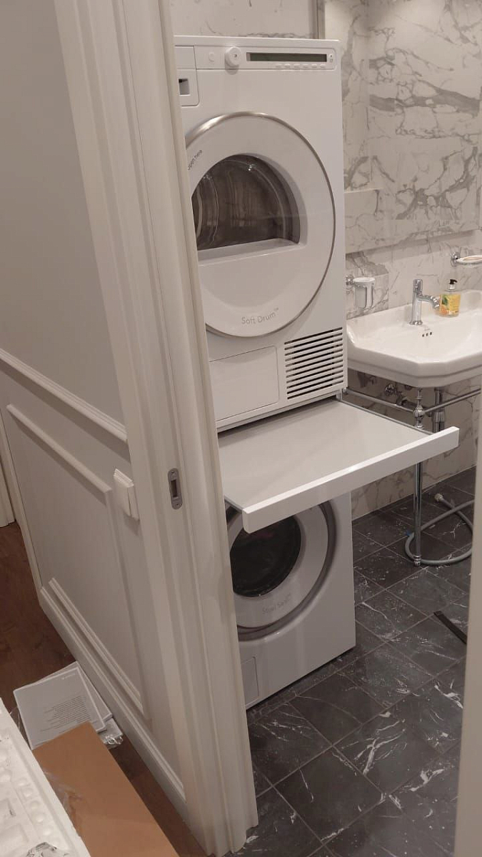 Выдвижная полка удобна в быту: белая, аккуратно встает между стиральной и сушильной машинами.